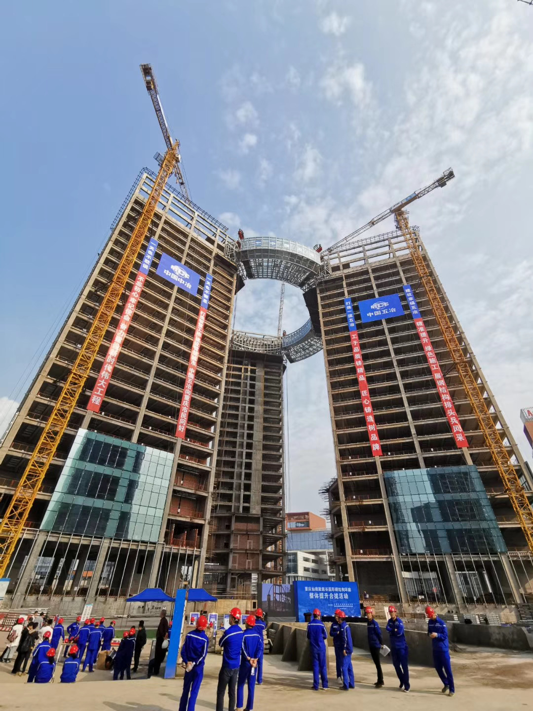 11月4日,經(jīng)過30小時的提升施工,由中國五冶承建,我公司負責(zé)鋼結(jié)構(gòu)環(huán)廊整體提升施工,被譽為巨型“鋼指環(huán)”的仙桃數(shù)據(jù)谷9號樓鋼結(jié)構(gòu)高空環(huán)廊外徑達32.6米,內(nèi)徑為20.6米,總重達2060噸,其中鋼結(jié)構(gòu)重量達1800噸,環(huán)廊在99.8米的高空無縫串聯(lián)起3座支撐它的塔樓,成為數(shù)據(jù)谷內(nèi)的地標(biāo)。