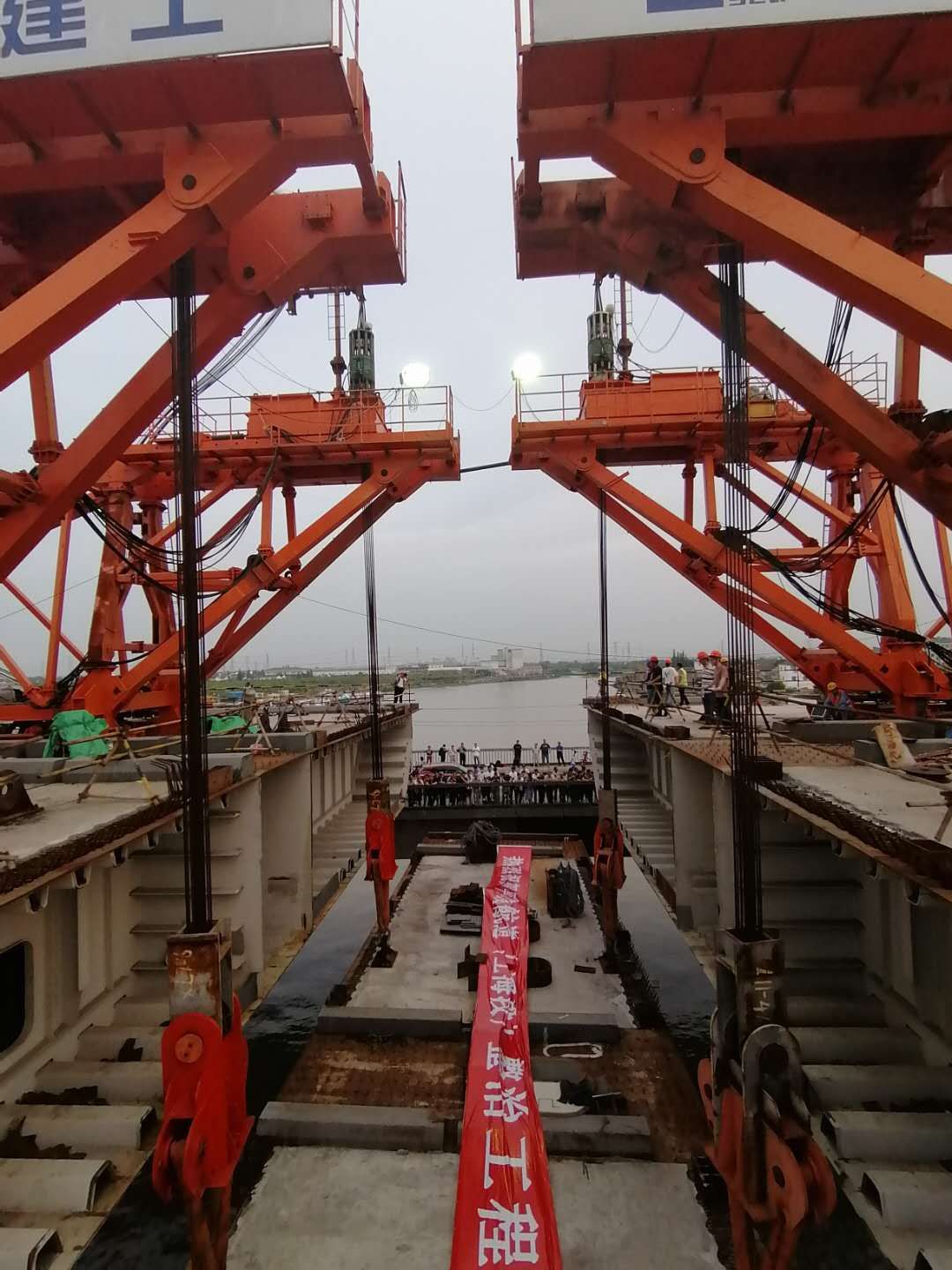 5月20日,經過三個小時的提升施工,重達126噸的主跨中段順利提升到位,標志著由上海建工基礎集團承建的平申線航道(上海段)整治工程泖港大橋主橋順利合龍。我公司負責主橋中跨鋼箱梁安裝施工,采用4臺250t同新橋面吊機進行安裝就位,共17段鋼箱梁,標準段重175噸,共16段,中間合龍段重126噸,共1段。