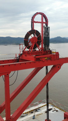 舟岱跨海大橋主通航孔橋自2017年9月開(kāi)建,大橋設(shè)計(jì)為三塔雙索面鋼箱梁斜拉橋,全長(zhǎng)1630米,主跨2×550米。大橋主墩承臺(tái)共有3個(gè)10萬(wàn)噸級(jí)防撞鋼套箱,采用內(nèi)外雙層鋼套箱防撞設(shè)計(jì),單個(gè)承臺(tái)套箱重達(dá)2600噸。本公司負(fù)責(zé)舟岱大橋3#、4#、5#主橋墩橋面鋼箱梁施工,總共起吊94個(gè)梁段。梁段重量不超過(guò)320t。一個(gè)斷面布置2臺(tái)橋面吊機(jī),共計(jì)采用12臺(tái),單臺(tái)吊機(jī)設(shè)計(jì)額定起重量160t,提升油缸額定起升荷載350t。本次鋼箱梁合龍采用自然合龍方案,按次邊跨、邊跨、中跨合龍順序進(jìn)行,至多偏差3毫米,趕在臺(tái)風(fēng)季來(lái)臨前實(shí)現(xiàn)合龍,比計(jì)劃工期提前一個(gè)月,為今年年底全橋合龍夯實(shí)了基礎(chǔ)。