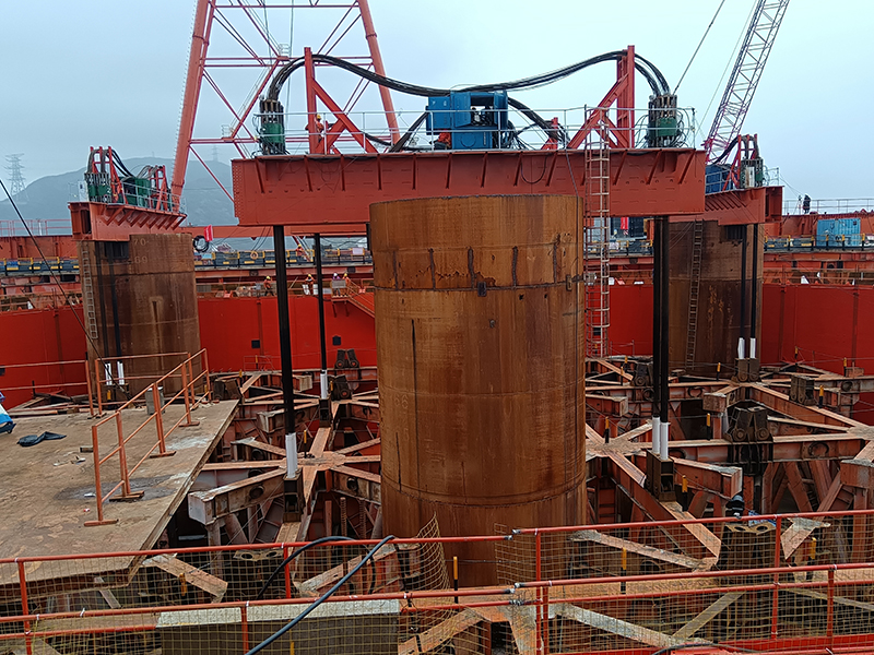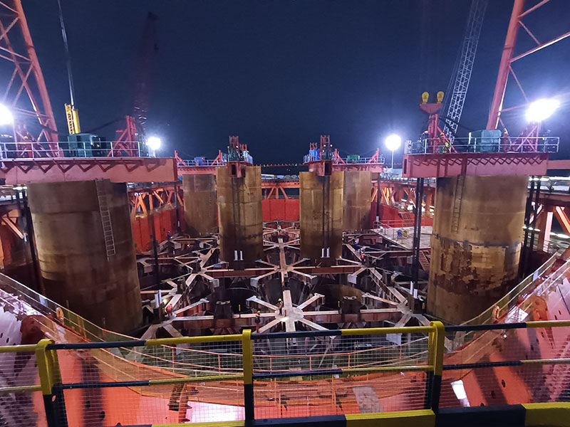 2024年3月15日,經(jīng)過7個小時的連續(xù)下放作業(yè),重達(dá)4500噸5號主塔鋼套箱順利下放到設(shè)計標(biāo)高。5號主塔墩鋼圍堰采用永臨結(jié)合方案,利用防撞箱作為主體防撞結(jié)構(gòu),同時兼作承臺施工用的鋼圍堰側(cè)板,并利用承臺范圍內(nèi)既有自浮式鋼桁架施工平臺的下弦桿作圍堰底龍骨、上弦桿作圍堰內(nèi)支撐系統(tǒng)。鋼圍堰體積大,下放難度高,下放共設(shè)置12個下放吊點(diǎn),在六根接高鋼護(hù)筒頂部安裝分配梁和提升下放系統(tǒng),并通過24臺350噸連續(xù)提升油缸同步作業(yè),整體下放重量約4500噸,下放總高度14.9米,后期下放系統(tǒng)兼作圍堰封底吊掛系統(tǒng)的一部分。將再布置24個吊掛點(diǎn),共72個吊掛點(diǎn),吊掛系統(tǒng)安裝好后,進(jìn)行封底作業(yè)。