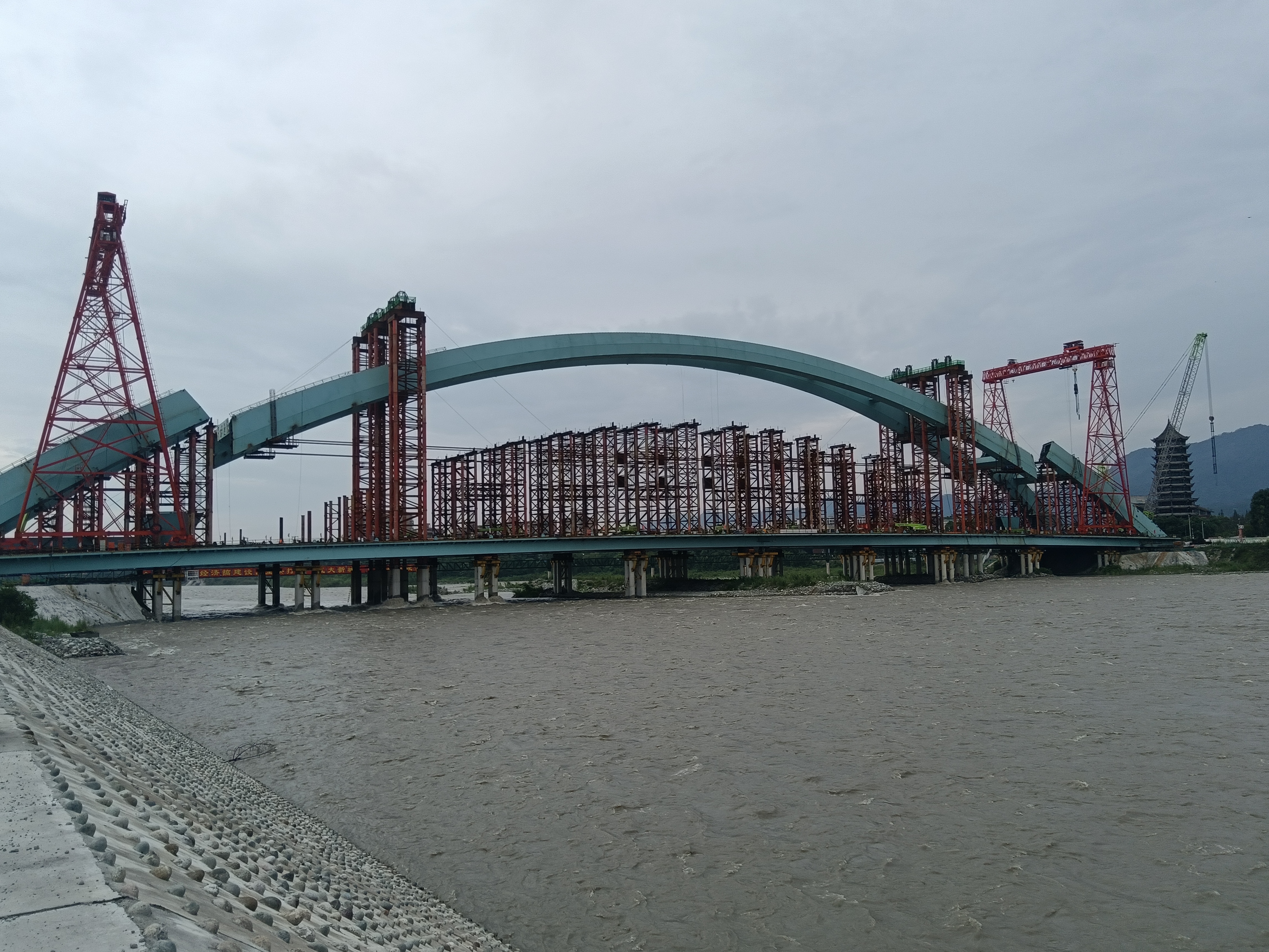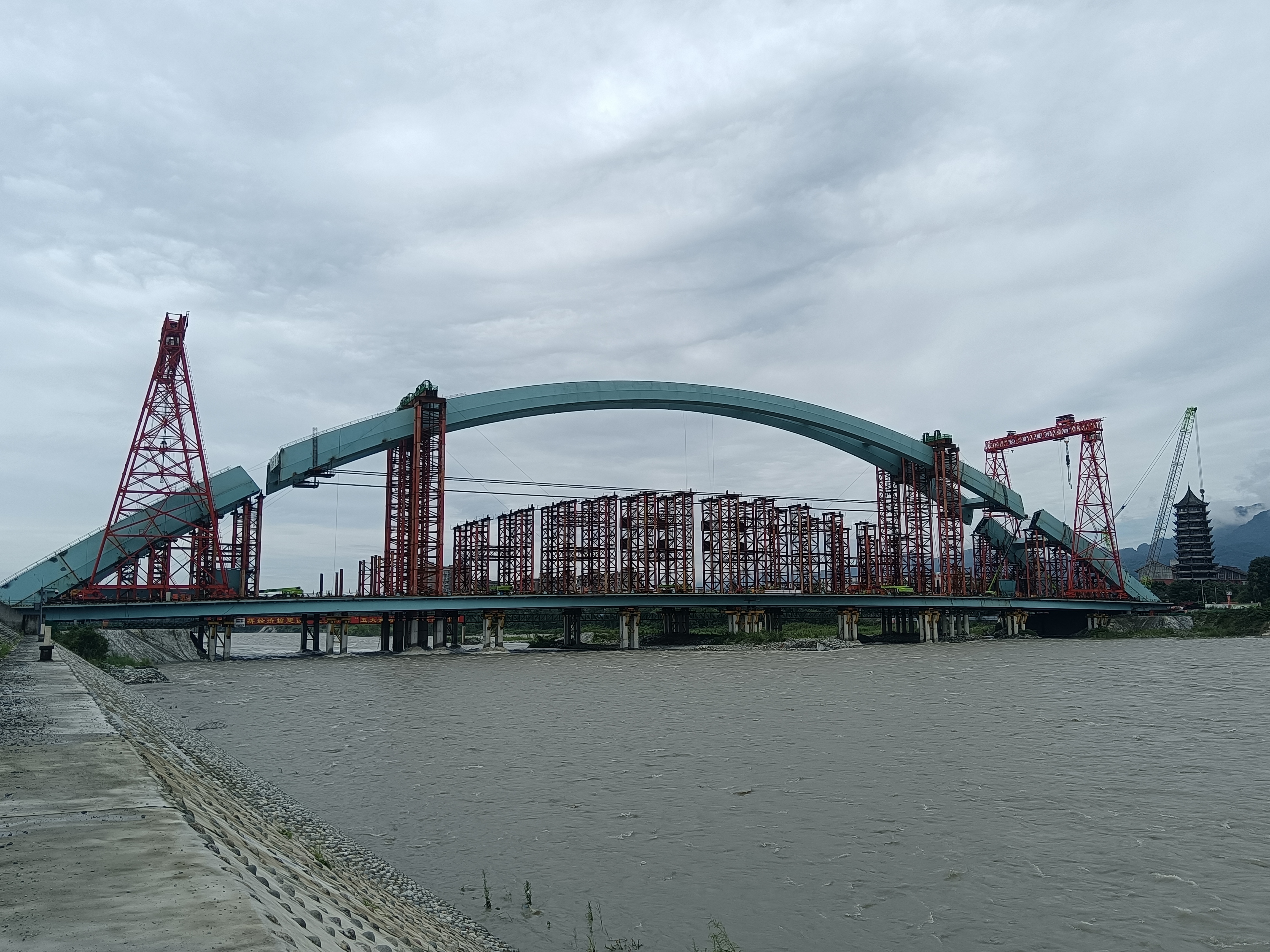 2025年7月7日,隨著都江堰青城大橋鋼拱肋提升精確合龍就位。青城大橋自2025年7月5日鋼拱肋提升加載脫架,歷時12個小時,鋼拱肋順利提升就位,標(biāo)志著青城大橋主體結(jié)構(gòu)進(jìn)入合攏段安裝焊接階段。青城大橋重建橋梁結(jié)構(gòu)為系桿提籃拱橋,拱肋矢高61米,橋梁全長353.3m,提升段跨距211m,提升高度約25.5m,提升重量達(dá)到4500t。鋼拱肋采用“橋面低位臥拼+整體提升”施工工藝。通過施工方案優(yōu)化整合,工藝創(chuàng)新,結(jié)構(gòu)模塊化施工建造,現(xiàn)場流水線作業(yè),鋼拱肋順利提升就位。