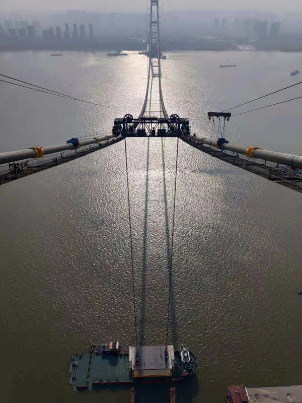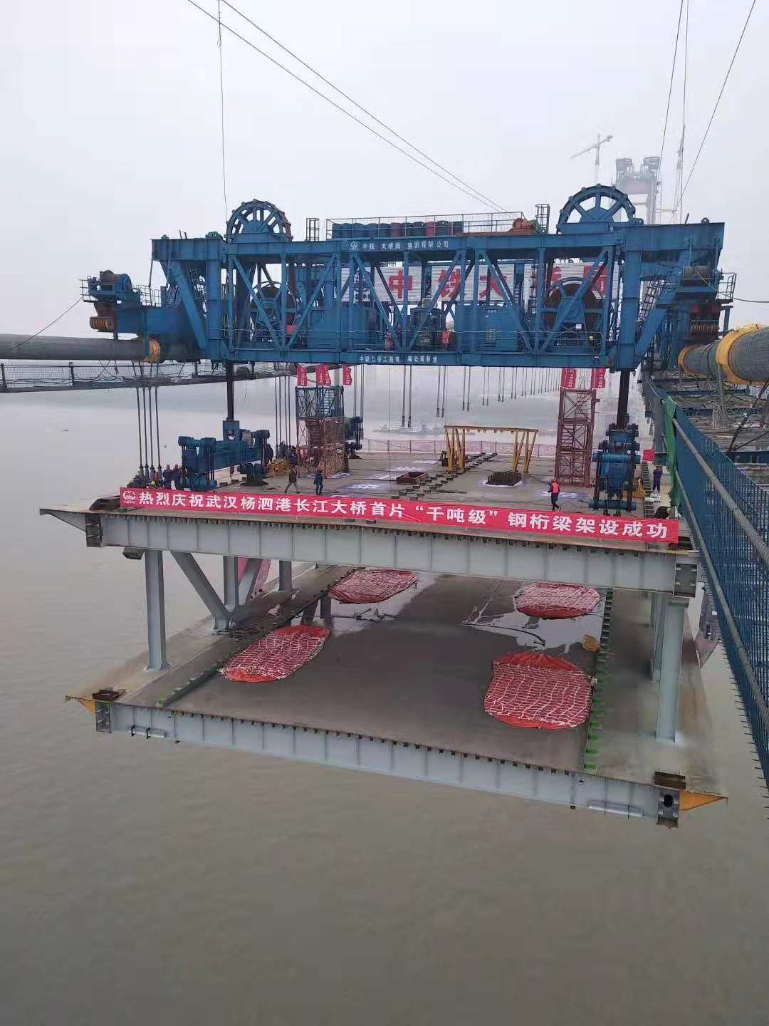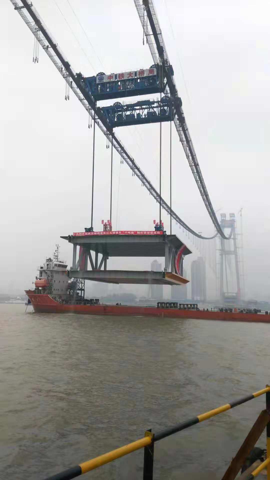 2018年11月15日,隨著兩臺(tái)纜載吊機(jī)將長36米、寬 32.5米、高10米的鋼梁提升到指定高度,由中鐵大橋院設(shè)計(jì)、中鐵大橋局施工的武漢楊泗港長江大橋主跨整節(jié)鋼梁架設(shè)成功,這標(biāo)志著跨度雙層公路懸索橋建設(shè)取得突破性進(jìn)展。