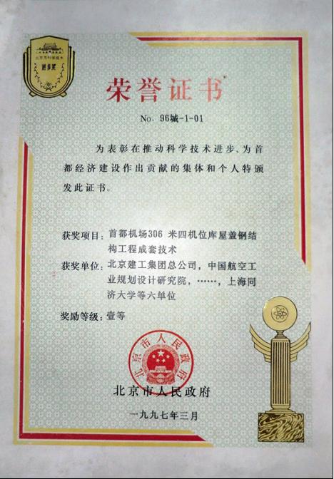 北京市人民政府頒發(fā)的一等榮譽(yù)證書