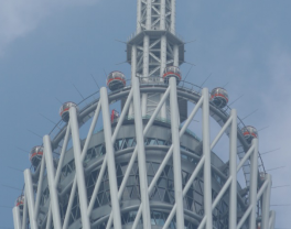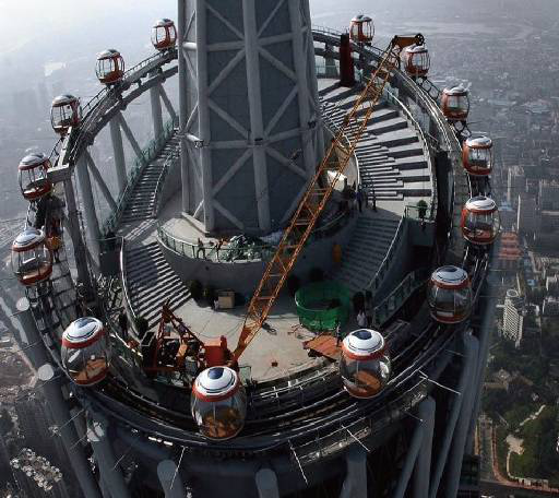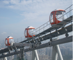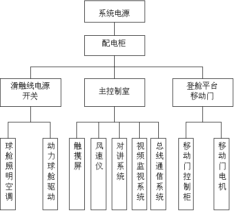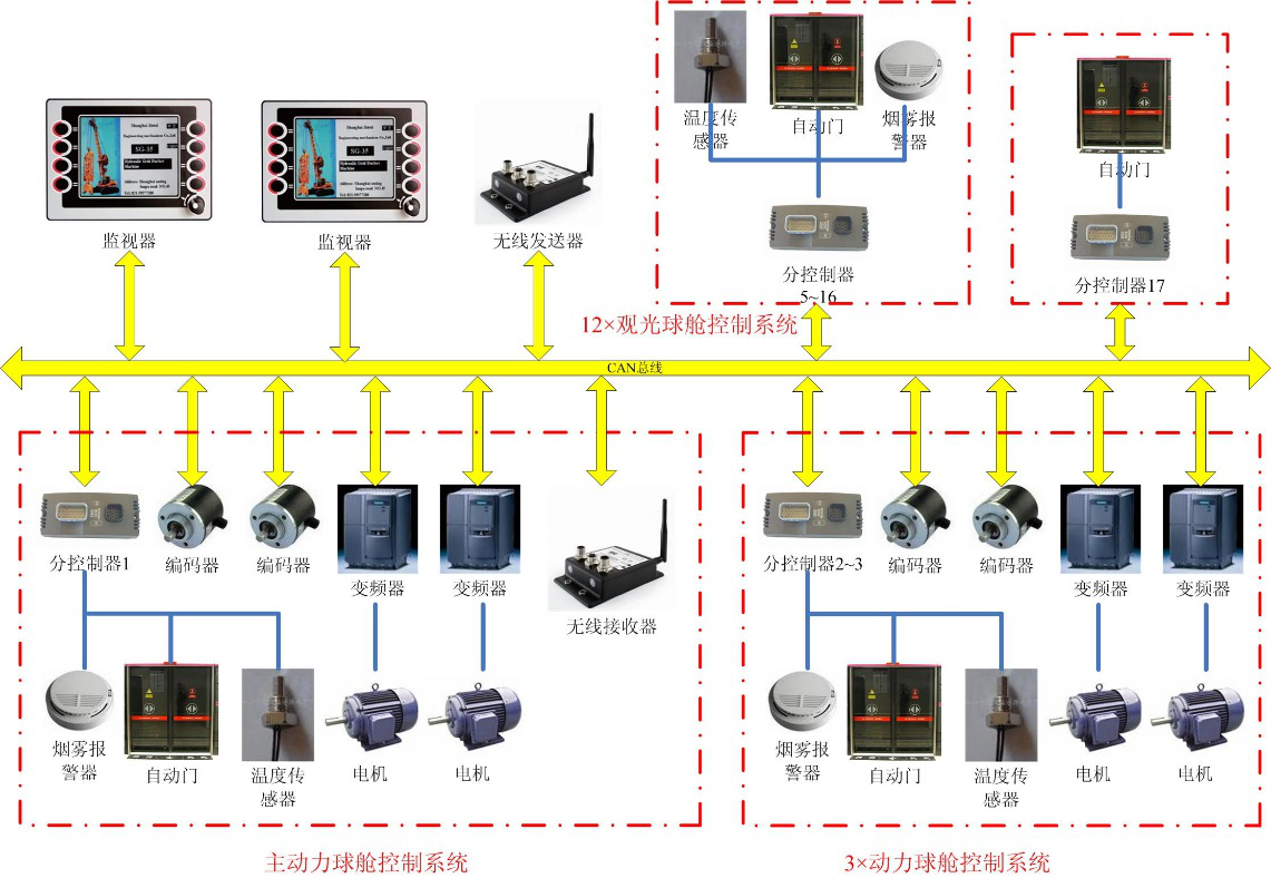 本觀光設(shè)施建于廣州新電視塔454米高度的塔頂廣場上,整個觀光設(shè)施由16個球形球艙通過牽引鋼纜串聯(lián)而成,其中4個球艙配用動力車,通過動力車輪胎與調(diào)平軌道豎板摩擦產(chǎn)生摩擦力從而帶動整個設(shè)施慢速運動。在塔頂廣場低端區(qū)域設(shè)有乘客上下區(qū),站臺屏蔽門與球艙門同步開閉,供乘客進出球艙。公司負責整個項目的電控系統(tǒng)的設(shè)計制造、廠內(nèi)試驗和現(xiàn)場安裝調(diào)試。